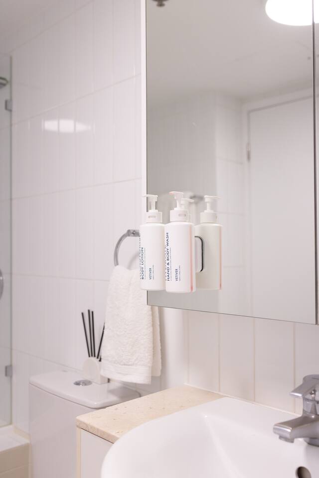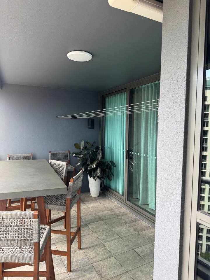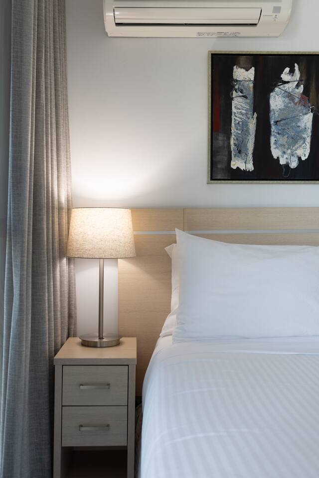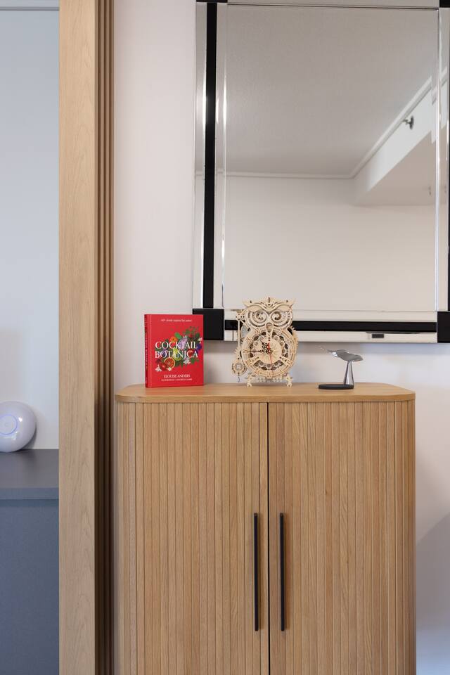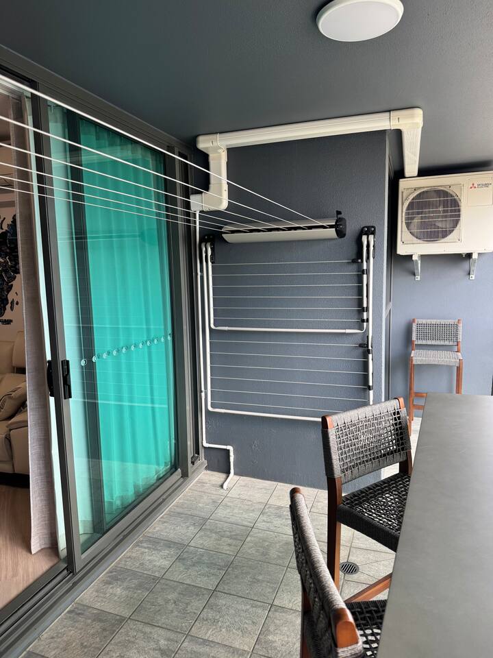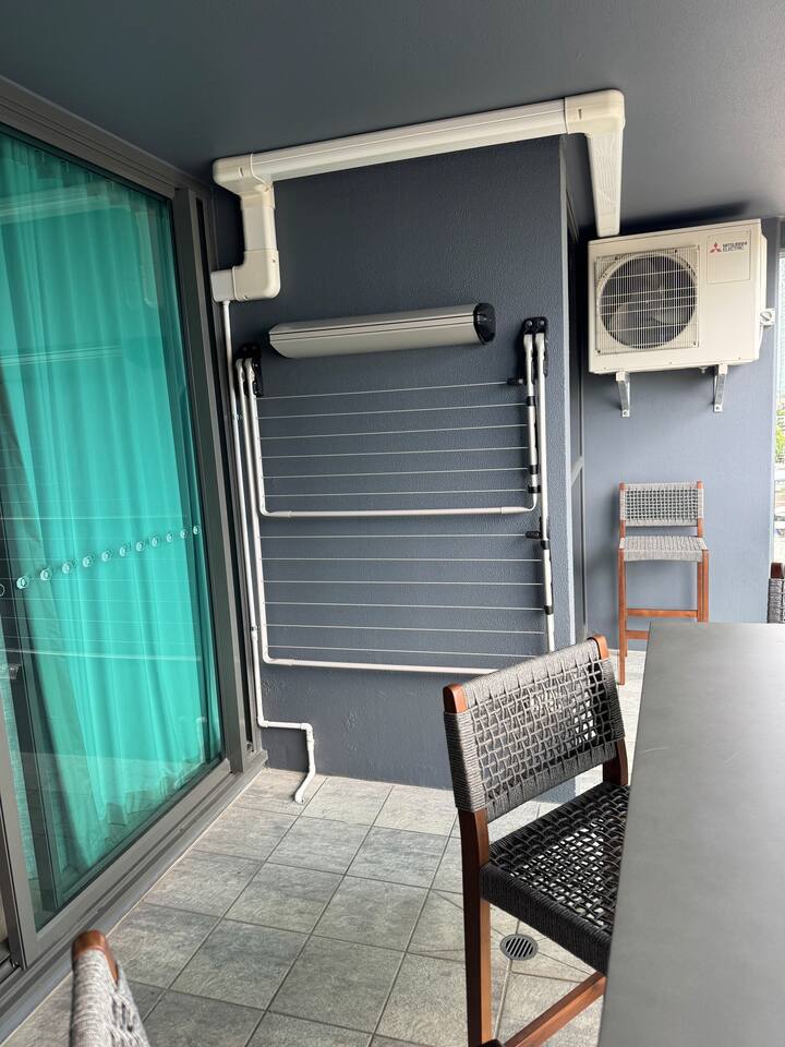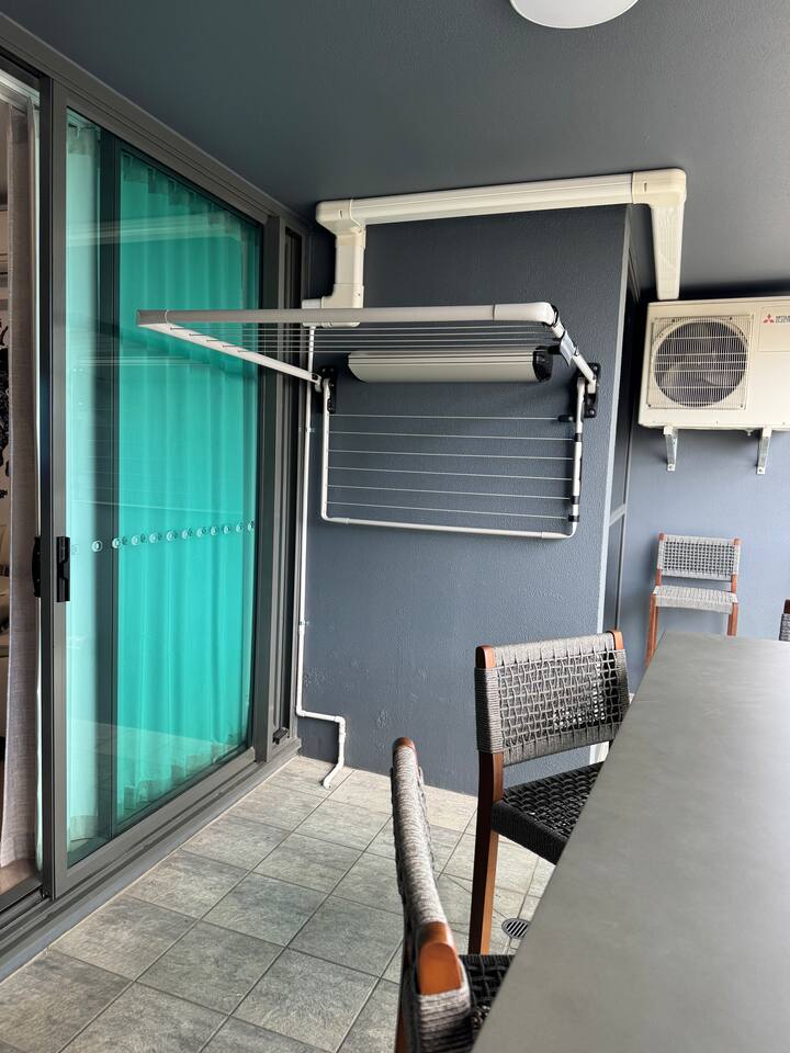 Your private bedroom and bathroom are just for you. However, the laundry area, including a washing machine/dryer, is housed inside a wall cupboard within your bathroom, so your host or a guest in the other bedroom will need occasional access to the laundry facilities. Your key-lockable bedroom is 100% private and just for you. However, you will share the living area, kitchen, and balcony with us or, if we are away, the guest in the other bedroom. These communal spaces offer a truly relaxed and sociable environment. Enjoy the apartment’s amenities, including a fully Equipped Kitchen with state-of-the-art kitchen appliances. Experience incredible sound with the SONOS system and watch your favourite shows on the large wall-mounted 4K LG Smart TV. In addition to the apartment features, you are welcome to access all on-site building facilities, such as the 25-meter heated lap pool, Heated spa, Sauna, BBQ area, and fully equipped Gym.