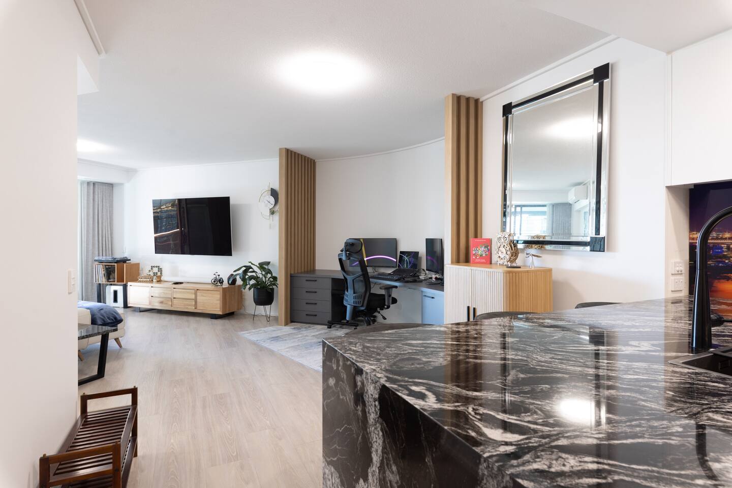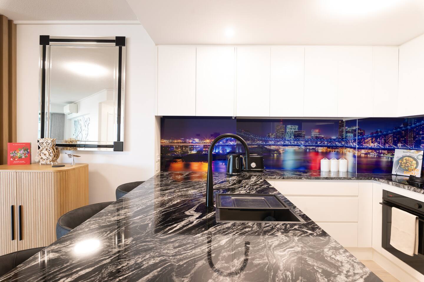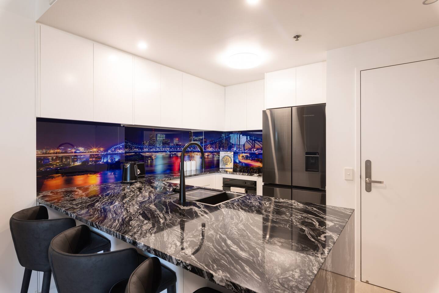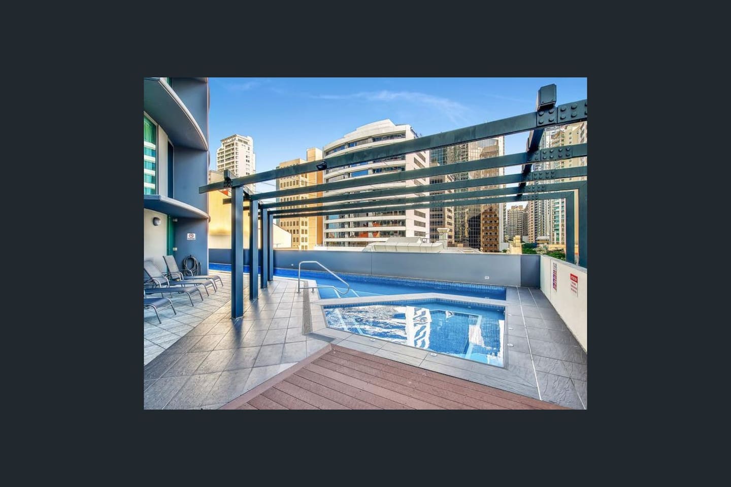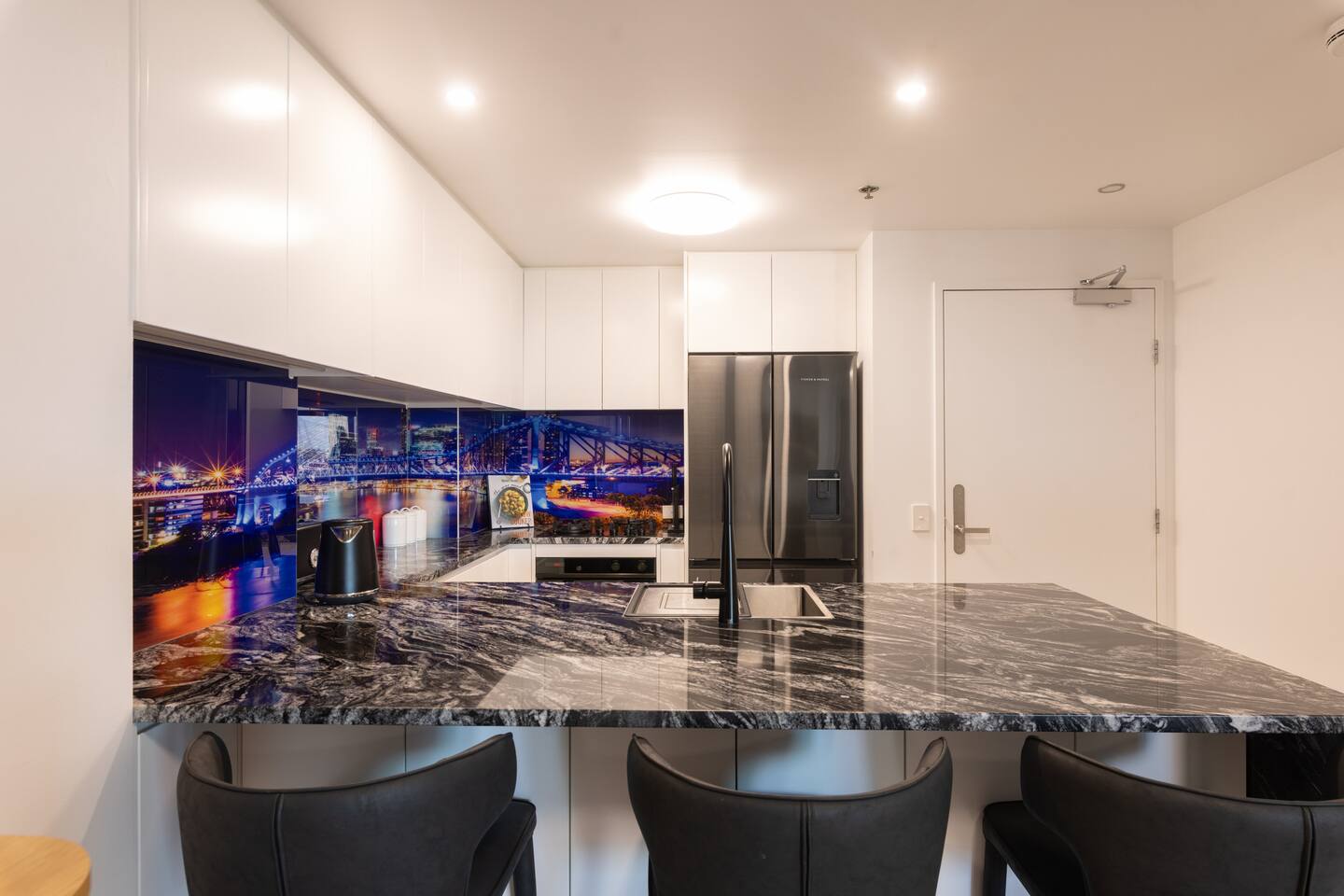 Your private bedroom and bathroom are just for you. However, the laundry area, including a washing machine/dryer, is housed inside a wall cupboard within your bathroom, so your host or a guest in the other bedroom will need occasional access to the laundry facilities. Your key-lockable bedroom is 100% private and just for you. However, you will share the living area, kitchen, and balcony with us or, if we are away, the guest in the other bedroom. These communal spaces offer a truly relaxed and sociable environment. Enjoy the apartment’s amenities, including a fully Equipped Kitchen with state-of-the-art kitchen appliances. Experience incredible sound with the SONOS system and watch your favourite shows on the large wall-mounted 4K LG Smart TV. In addition to the apartment features, you are welcome to access all on-site building facilities, such as the 25-meter heated lap pool, Heated spa, Sauna, BBQ area, and fully equipped Gym.