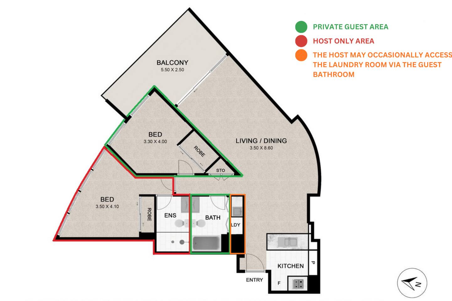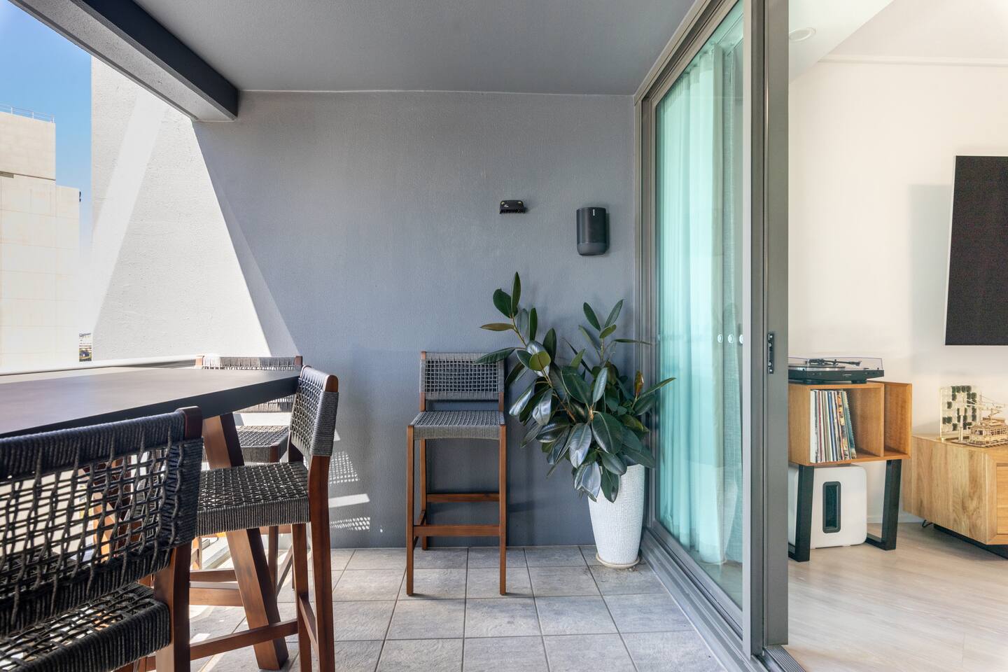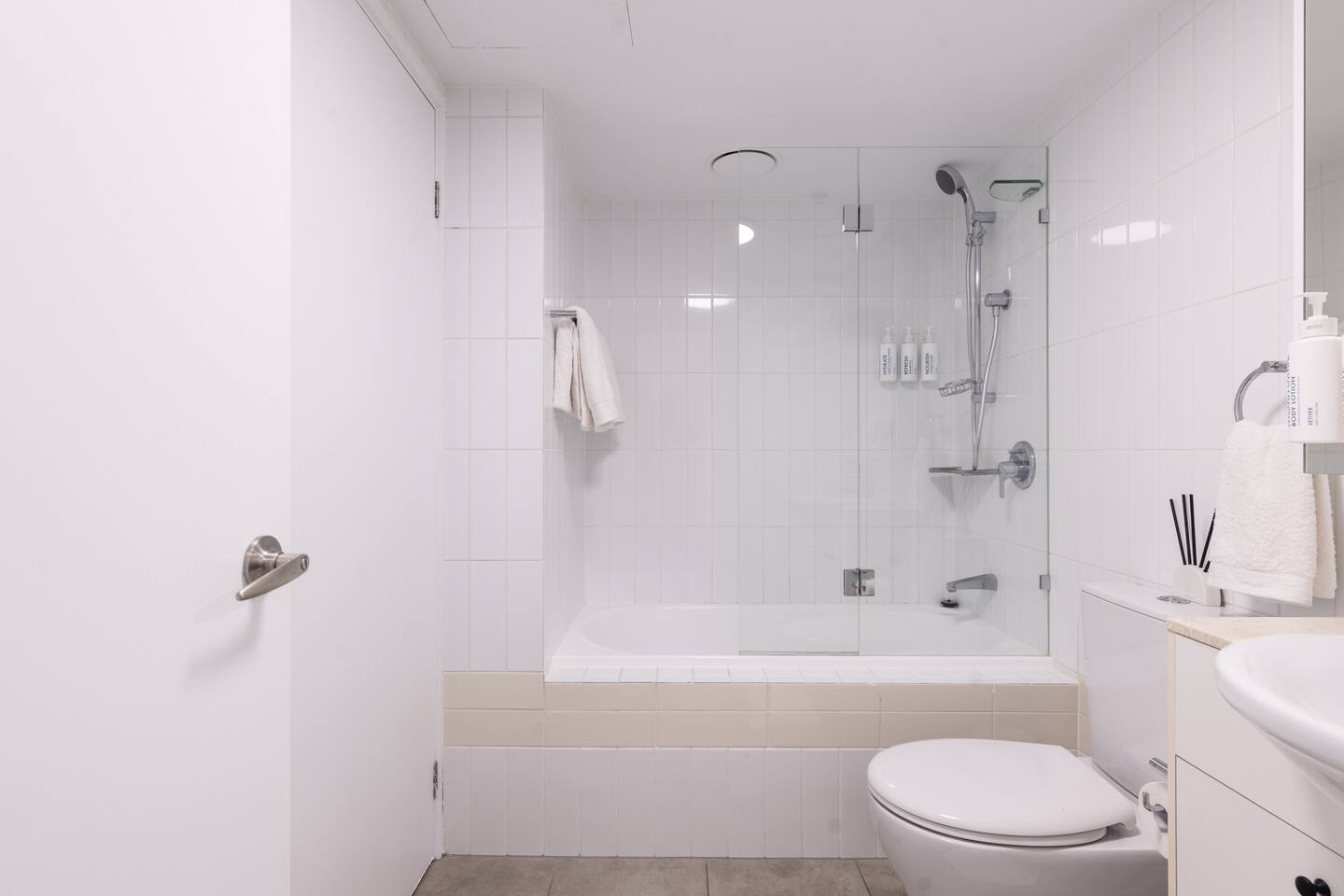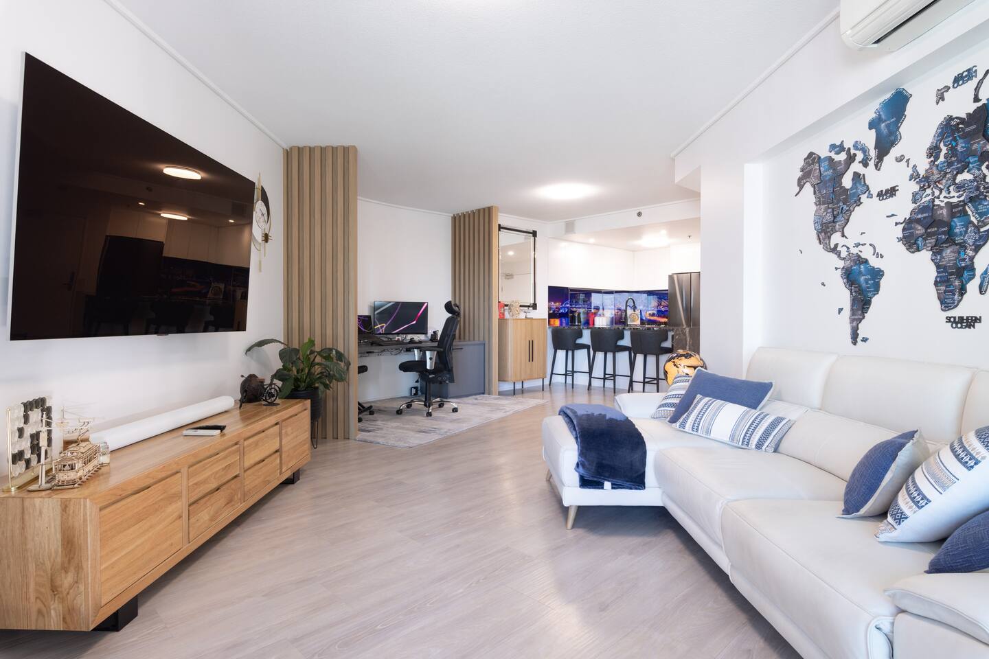 Your private bedroom and bathroom are just for you. However, the laundry area, including a washing machine/dryer, is housed inside a wall cupboard within your bathroom, so your host or a guest in the other bedroom will need occasional access to the laundry facilities. Your key-lockable bedroom is 100% private and just for you. However, you will share the living area, kitchen, and balcony with us or, if we are away, the guest in the other bedroom. These communal spaces offer a truly relaxed and sociable environment. Enjoy the apartment’s amenities, including a fully Equipped Kitchen with state-of-the-art kitchen appliances. Experience incredible sound with the SONOS system and watch your favourite shows on the large wall-mounted 4K LG Smart TV. In addition to the apartment features, you are welcome to access all on-site building facilities, such as the 25-meter heated lap pool, Heated spa, Sauna, BBQ area, and fully equipped Gym.