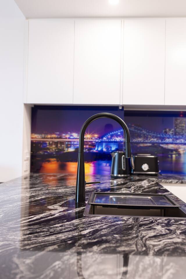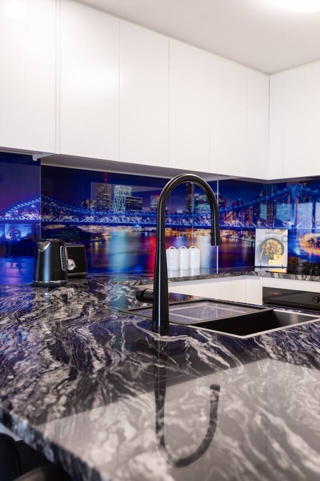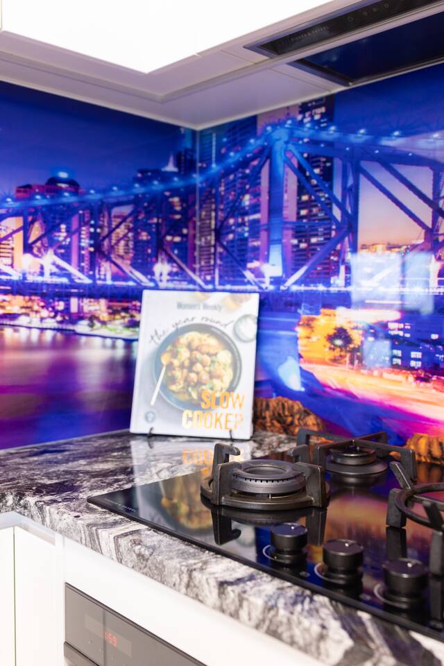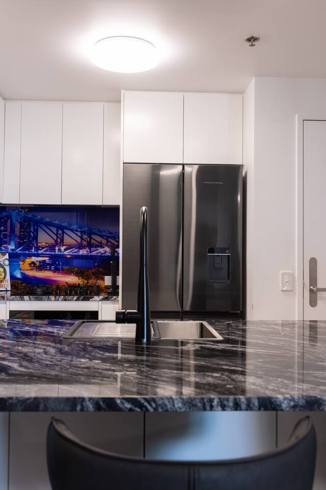 Enjoy full access to an array of premium building leisure facilities, including the 25-meter Heated Lap Pool, complete with a stylish sun deck and comfortable sun lounges, sauna, and heated Spa. Plus, stay active with access to our fully equipped Gym and large BBQ Area. The kitchen embodies sophistication and quality. Featuring a striking glass splashback showcasing the iconic Story Bridge, elegant real granite stone benchtops, and premium Fisher and Paykel appliances—including a microwave, oven, full-size fridge/freezer, and a convenient dishwasher drawer—this space makes both cooking and clean-up a delight. From a queen-sized bed, your bedroom offers captivating views of the Story Bridge and the river. The main living room has a large wall-mounted 4K smart TV and a reverse-cycle split system AC. You’ll also appreciate unrestricted access to your separate bathroom outside your bedroom door. The apartment is designed for business travellers and provides high-speed internet Wi-Fi and even a printer/scanner.